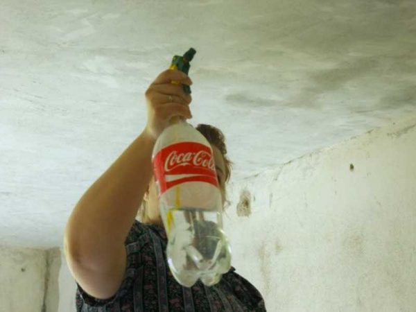 Для такого «латочного» ремонту необхідно використовувати точно таке ж засіб, яким був покритий весь стелю. В першу чергу необхідно позбутися від джерела появи плям. Якщо це протікання в трубах, то спочатку слід виправити цю проблему, а вже потім приступати до виправлення її наслідків. Зіпсоване жовтими плямами місце слід звільнити від побілки, потім потрібно очистити бетонну плиту від плям за допомогою мочалки і «Білизни». Після очищення потрібно знову все помити, а після висихання можна робити «латку» зі свіжої побілки. Якщо все зроблено правильно, то слідів боротьби з жовтими плямами може взагалі не залишитися.