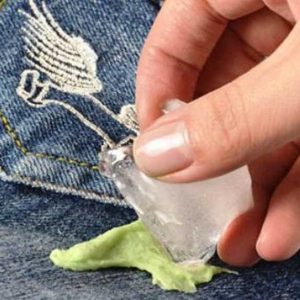 Щоб ефективно видалити жуйку з штанів або іншого одягу, можна скористатися способом заморожування. Поверніть одяг і покладіть в поліетиленовий пакет, потім помістіть пакет на кілька годин в морозильну камеру. Після цього жуйка легко ототрется, так як під дією холоду її складові компоненти зруйнуються. Якщо немає можливості використовувати морозилку або не дозволяють габарити (липучка прилипла до крісла чи товстого плед), спробуйте прикласти лід на забруднене місце. Почекайте до тих пір, поки не почнеться період розпаду, і сміливо починайте відтирати пляма підручними пристосуваннями.