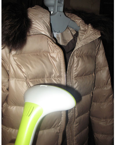 Парогенератором пуховик розгладжують (отпаривают) у вертикальному положенні на відстані 15 см від виробу. Проводять парогенератором зверху вниз по всій поверхні пуховика.