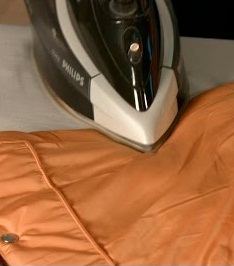 Праскою розгладжувати складки можна тільки на повністю просохшем пуховику. Вибираємо температуру прасування, орієнтуючись на інформацію на ярлику виробу. Гладимо через тонку тканину або марлю. Спочатку пробуємо пропрасувати непомітний ділянку пуховика, наприклад, з виворітного боку на подолі або на пробному шматочку тканини. Можна включити функцію пара, але тільки ручну, процес відпарювання ви самі контролюєте. Безперервне відпарювання встановлювати не рекомендується.