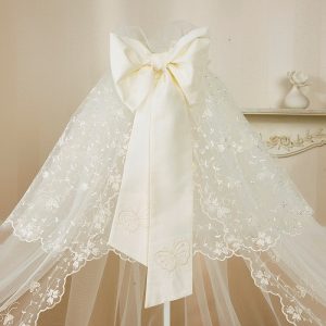 Після того як вдалося успішно закріпити утримувач і перевірити на міцність кріплення, можна починати одягати сам балдахін. Тканина балдахіна потрібно розподілити по всьому периметру ліжечка, а щоб вона не збивалась на одну сторону, можна гарно закріпити полотно декоративними стрічками або бантами, які будуть відповідати дизайну дитячої кімнати.