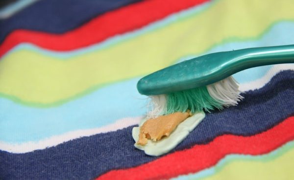 - Арахісове масло. Використовуючи цей метод необхідно бути гранично обережними — слідкуйте, щоб масло не потрапило на незабруднену область. Змастити необхідно тільки жуйку, потім зіскоблити її тонким тупим предметом (підійдуть ножиці, ніж). Після цього виперіть предмет гардероба вручну або в пральній машині. Якщо арахісове масло все ж потрапило на чисту область, нанесіть на неї трохи рідкого засобу для виведення плям.