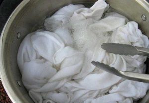 великий оцинкований бачок. Замість порошку при вываривании використовувати господарське мило. З 200 г мила готується стружка і розводиться в 5-7 літрах води, для посилення ефекту додайте 2 ст. л перекису водню або нашатирного спирту.