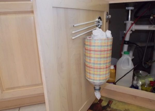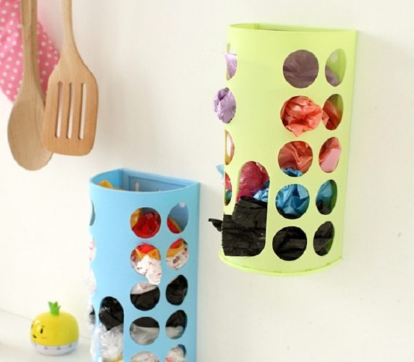Перший варіант відмінно підійде для тонких фасовочних пакетів, особливо якщо забезпечити його гачком для рейлінга. І не заважає, і завжди під рукою, і вигляд не псує.
