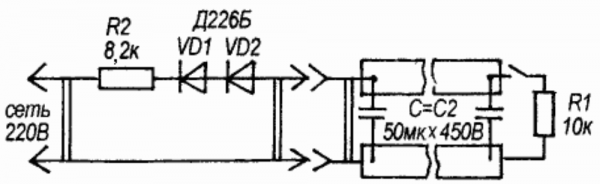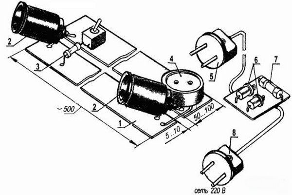 1 — пластина (односторонньо фольгований гетинакс s1, 2 шт); 2 — електролітичний конденсатор (2 шт), 3 — розрядний резистор R1, 4 — розетка, 5 — штепсельна вилка підключення навантаження, 6 — випрямні діоди, 7 – зарядний резистор R2, 8 — мережева штепсельна виделка з проводом