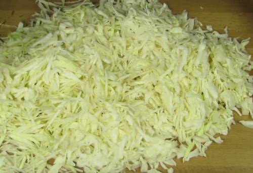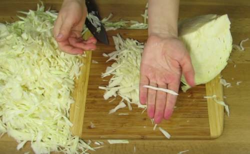 1. Нашаткуйте капусту тонкою соломкою і просолите її кількістю солі, яке розрахуєте в залежності від обсягу капусти без качана. Після того, як посолили, добре розмішайте і почніть м’яко розтирати капусту, трохи стискаючи, щоб вона пустила сік.