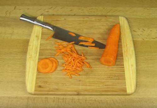 3. Моркву можна натерти на крупній тертці або нарізати ножем. Навіть терка для корейської моркви підійде, тут головне, щоб вона не була більше і товщі, ніж шматочки капусти при нарізці.