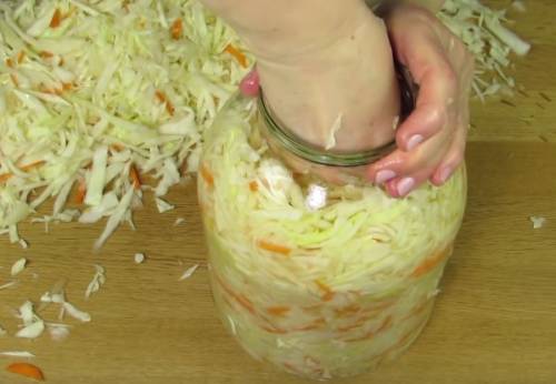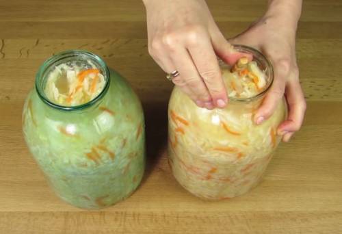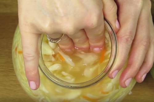 Якби квасили капусту у великій ємності, то можна було б поставити гніт, але в банку це зробити неможливо, тому можна час від часу приймати чимось капусту зверху.