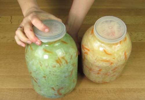 Тепер необхідно закрити банку з капустою кришкою, краще всього пластмасової, і прибрати в холодильник. Квашена капуста на зиму в банках зберігається виключно у холоді. Причому ідеальна температура від 0 до 3 градусів.
