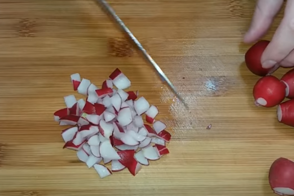4. Потім нарізаємо невеликими кубиками ковбасу, огірки, картоплю, яйця і редис. Все складаємо в ємність з зеленню.