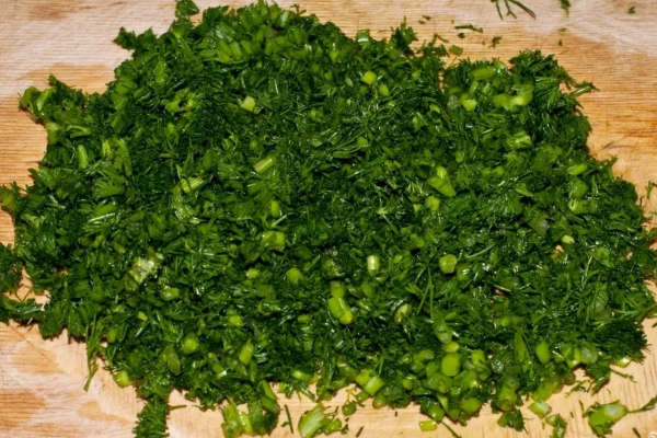 3. Спершу я завжди ріжу цибулю і кріп дуже дрібно. Складаю їх у каструлю обсягом 4 – 5 літрів. Трохи солю і пантелику, щоб виділився сік.