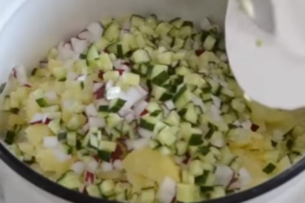 4. Потім нарізаємо дрібними кубика огірки, редис, яйця, картоплю і ковбасу. Складаємо все в каструлю.