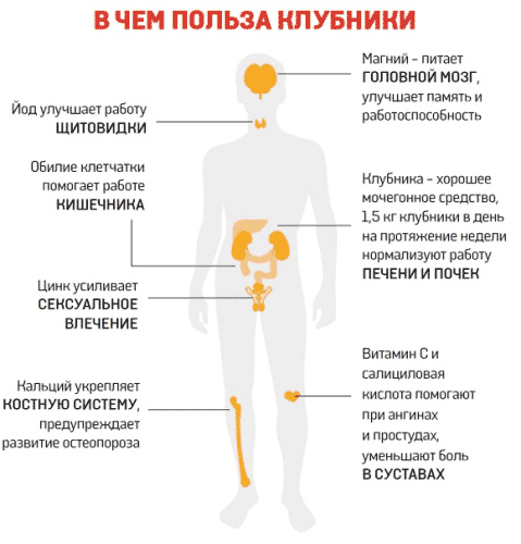 Ягоди цінні властивістю позбавляти від набряків і прискорювати процес схуднення. Солодкість плодів допомагає відновити емоційний стан, уникнути розвитку депресії. При вживанні органічні кислоти стимулюють роботу слинних залоз, що зміщує кислотно-лужний баланс в кислу сторону, пригнічує активність патогенної флори порожнини рота, зупиняє розвиток карієсу і пародонтозу. Полуниця має антивіковими властивості, зміцнює стінки судин, попереджає купероз.
