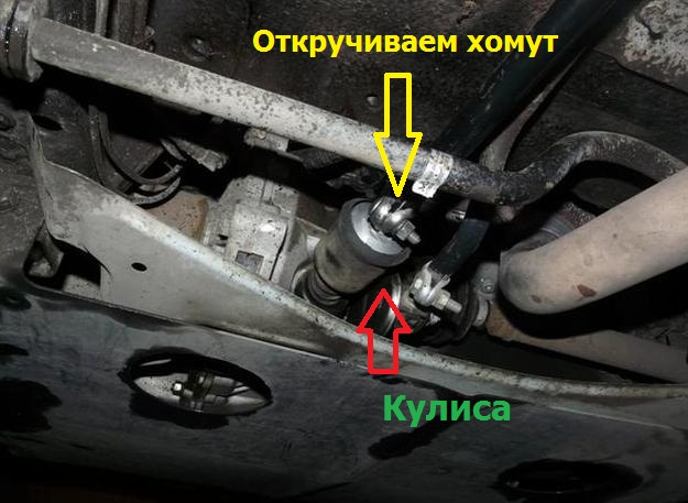 - По першій передачі. Якщо немає можливості включити задню передачу, можна провести регулювання куліси КПП по першій передачі. Для цього включаємо першу передачу, після чого послаблюємо хомут лаштунки. Далі повертаємо привід куліси проти годинникової стрілки до упору важеля КПП в пластиковий фіксатор задньої швидкості, і далі затягуємо хомут.