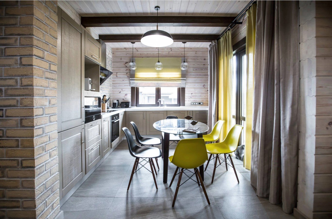 Центром уваги і прикрасою всього будинку може стати кухня, поєднана з вітальнею. Виходить дуже просторе приміщення. Чудово виглядає в таких кухнях меблі з цінних порід дерев. Тут можна поставити великий обідній стіл, за яким буде збиратися велика компанія. А господиня зможе легко готувати на такій кухні, завдяки близькості кухонних поверхонь.