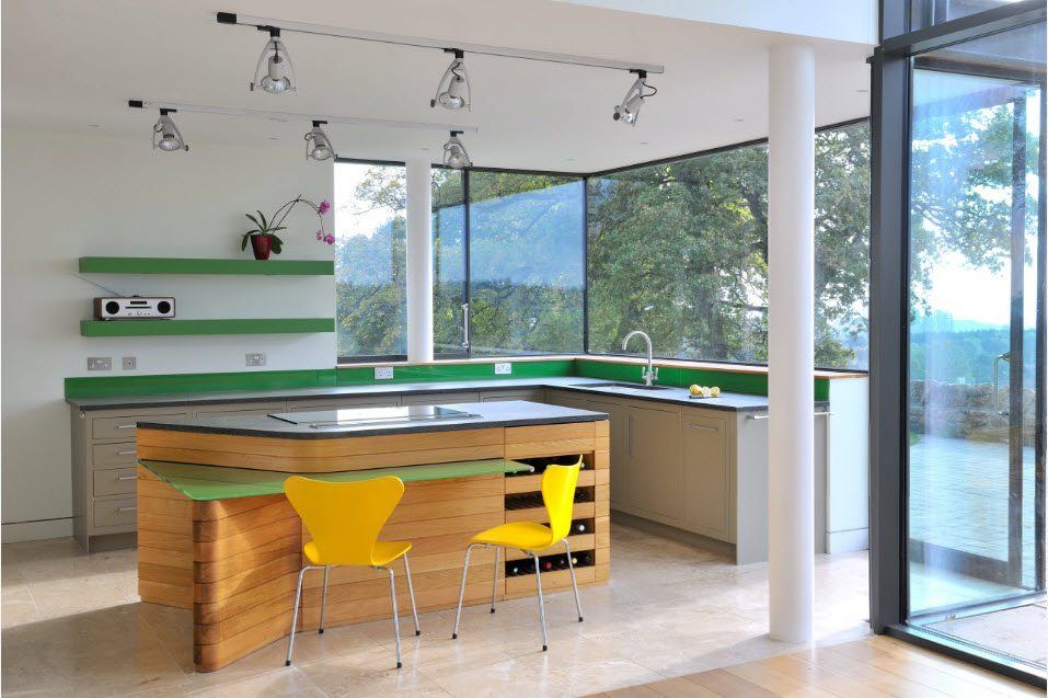Зелені кухні привертають увагу, вони дуже яскраві. Цей колір відмінно підійде для суміщених кухонь. Непогано виглядають варіації зеленого кольору хакі, болотний, лаймовий, салатовий, малахітовий, бірюзовий.