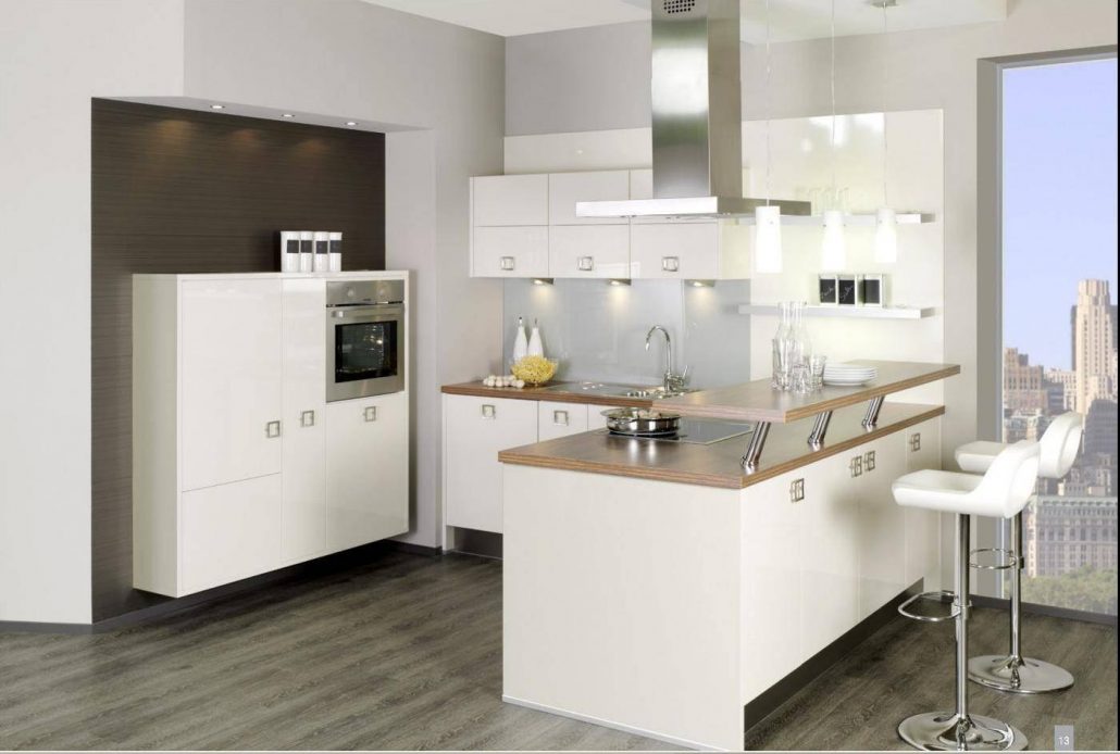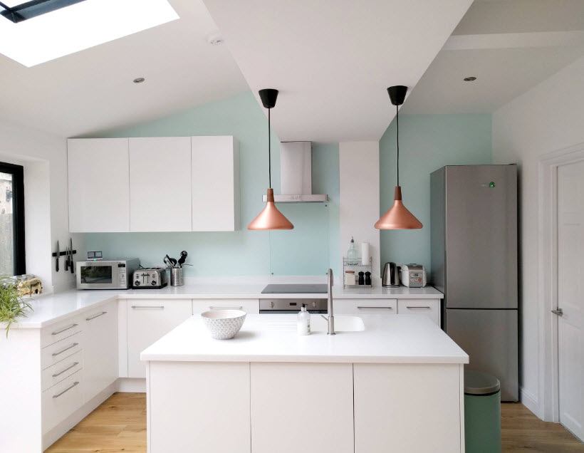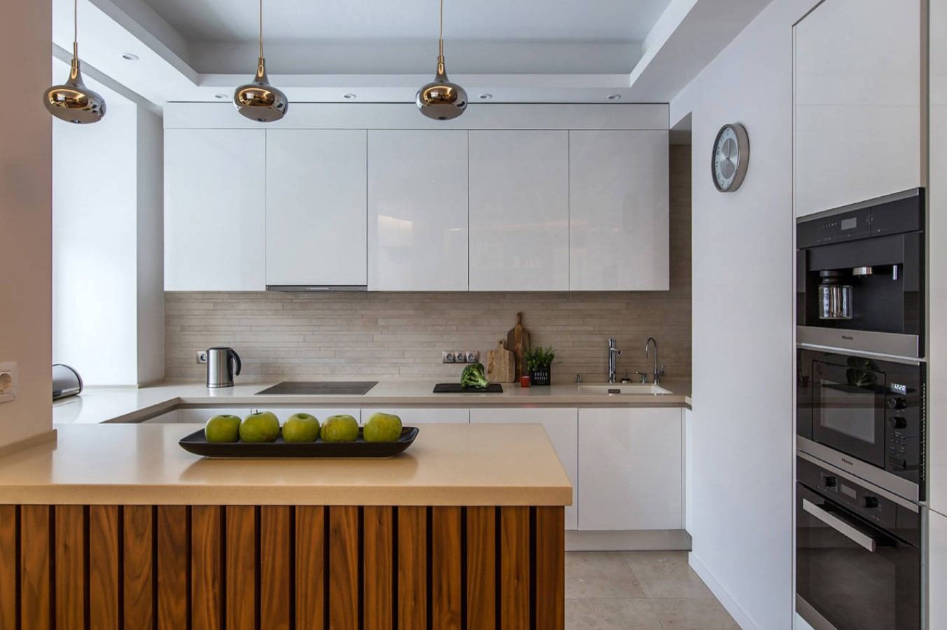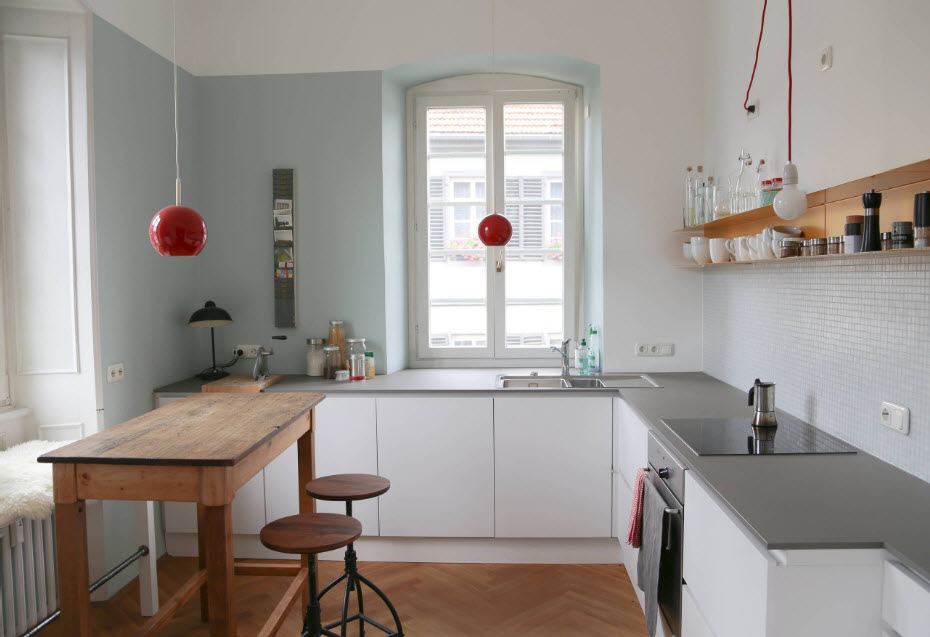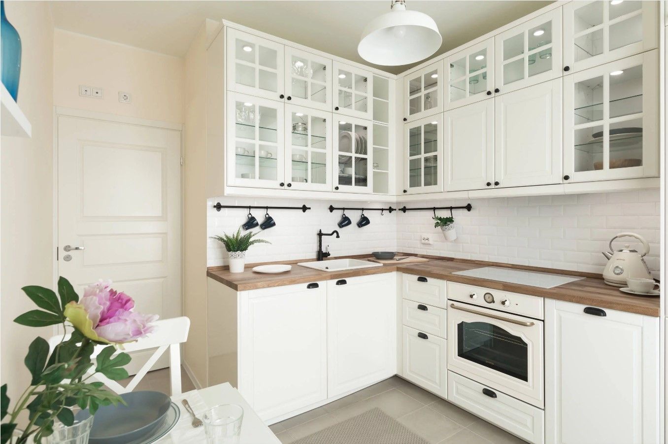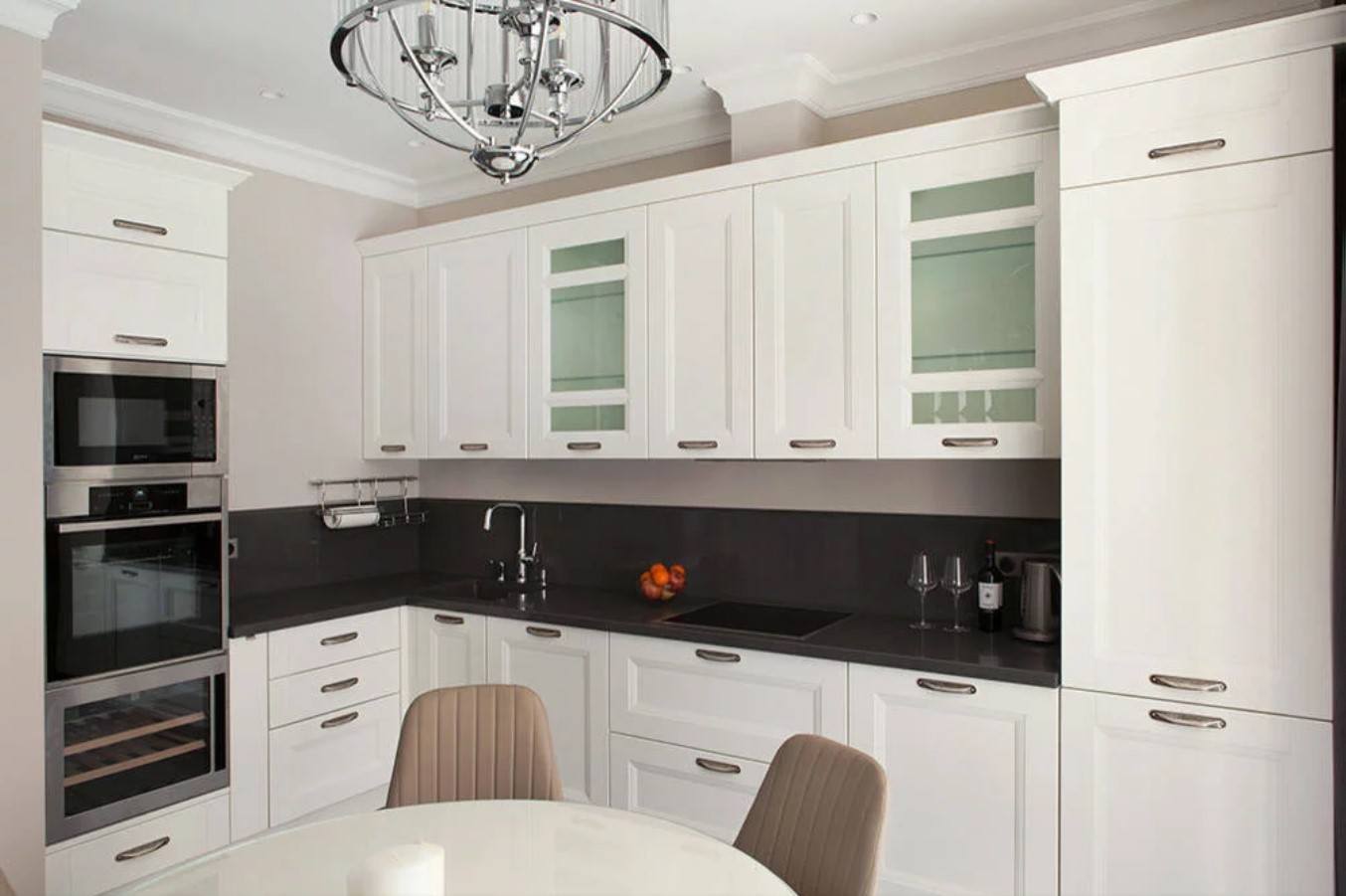 Білий колір візуально розширює простір. Якщо маленьку кухоньку зробити в білому кольорі – вона буде виглядати солідно. З цим кольором добре поєднуються чорний, градації сірого і металевий. Серйозний мінус білосніжною кухні – швидке забруднення. Необхідно часто все прибирати і мити, а це можуть собі дозволити не всі.