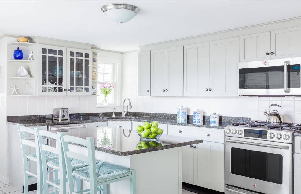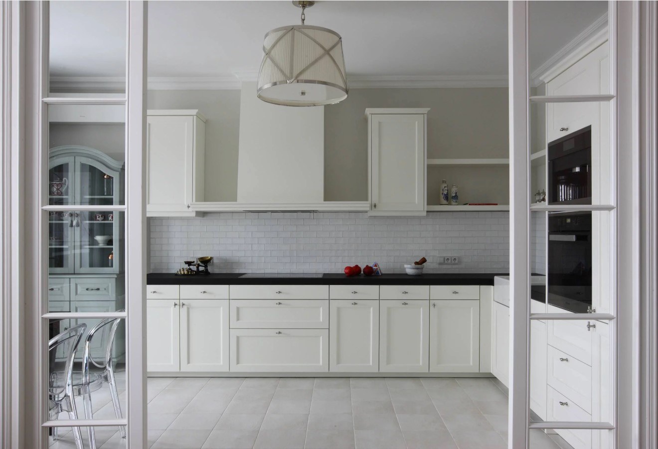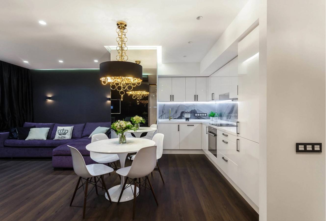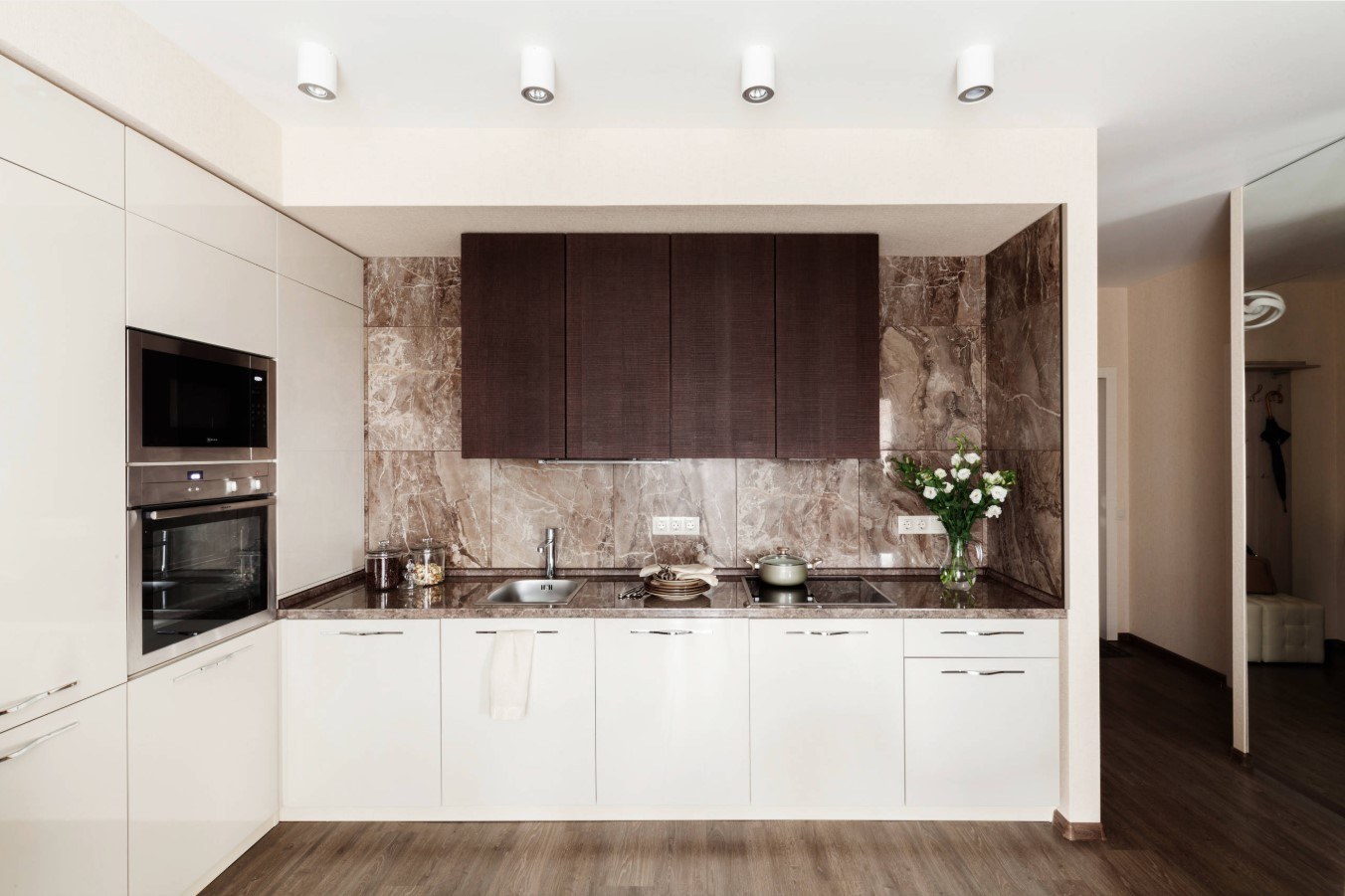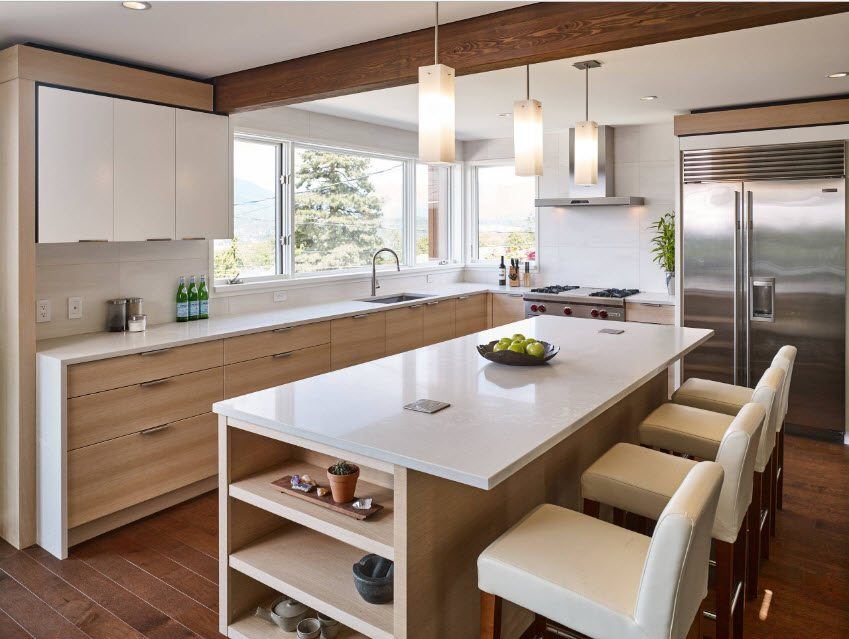 Білий колір візуально розширює простір. Якщо маленьку кухоньку зробити в білому кольорі – вона буде виглядати солідно. З цим кольором добре поєднуються чорний, градації сірого і металевий. Серйозний мінус білосніжною кухні – швидке забруднення. Необхідно часто все прибирати і мити, а це можуть собі дозволити не всі.