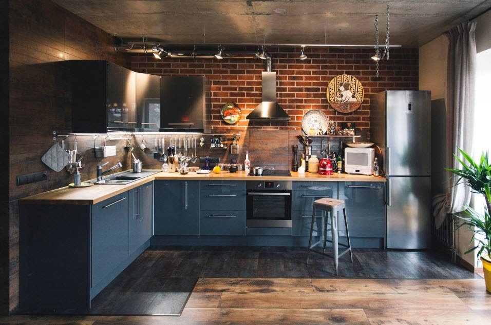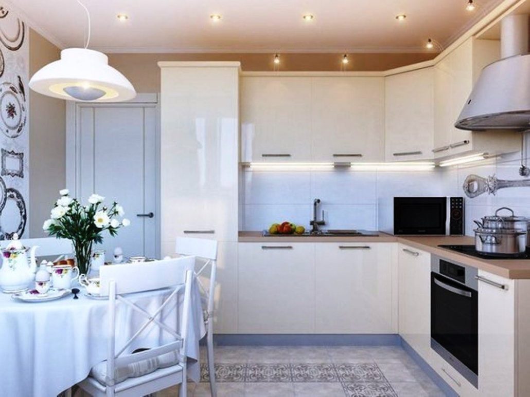 Для економії простору і візуального збільшення кутової кухні можна зовсім відмовитися від люстри на стелі. Замість неї допускається на нижню частину шаф наклеїти світлодіодну стрічку, а також встановити вбудовані світильники. Це дозволить зонувати освітлення і можливо світла стане ще більше.