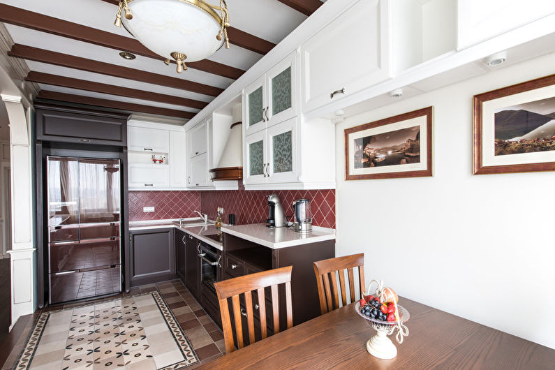 Стандартний білий стеля підійде для всіх кухонь. Такий колір ніколи не зіпсує задумку. Його можна пофарбувати трохи колированной фарбою в загальний колір кухні. Захоплюватися не треба. Їх-за того, що від темного стелі гірше відбивається світло, на кухні може бути темно.