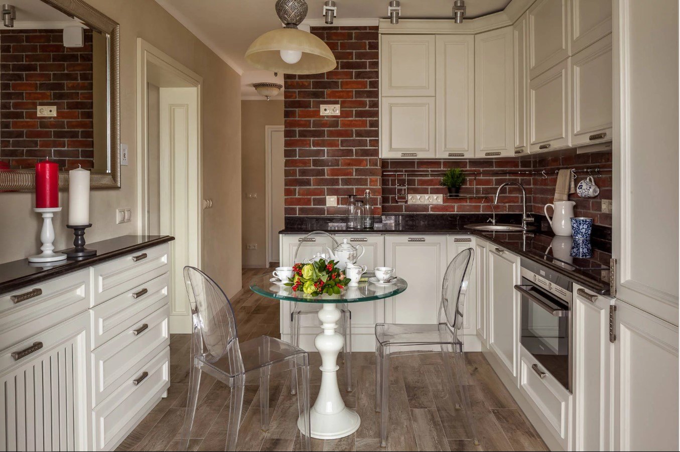 Обідній стіл нормальних розмірів на кутовий кухні маленьких розмірів не вдасться розмістити. Потрібно думати про його перенесення в іншу кімнату або про поєднання кухні.