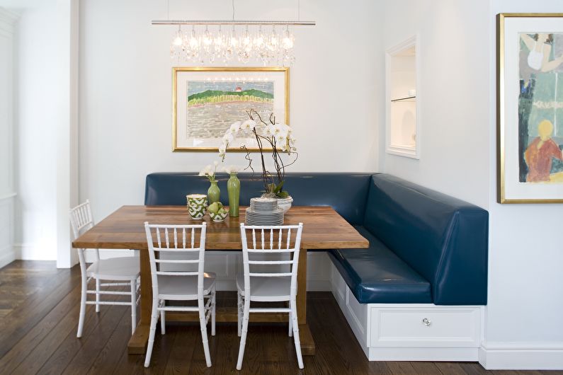Середнім і малим кухням підійде невеликий кухонний диван. У такому разі утворюється самостійна область разом з кухонним столом. Це буде виняток з правила – «вся кухонні меблі в одному стилі». Іноді можна дозволити собі деяку свободу. Бажано, щоб диван був трохи темніше столу.