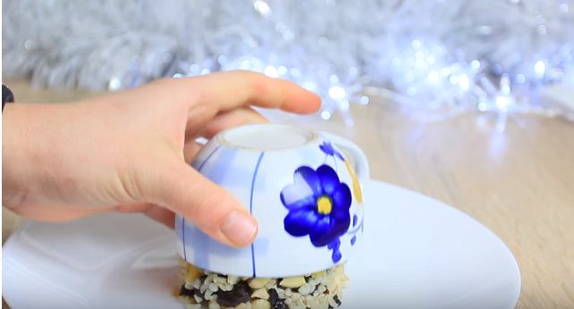7. Для красивої подачі беремо широку чашку для чаю і укладаємо туди частування. Зверху накриваємо стравою, так щоб чашка була на його середині, і акуратно перевертаємо. Прикрашаємо мигдалем і листочком м’яти.