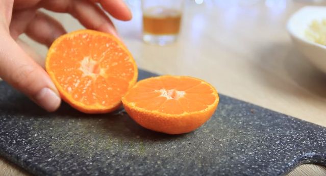 5. Мандарин розрізаємо на дві частини і збризкуємо його соком крупу.