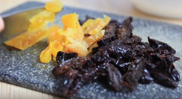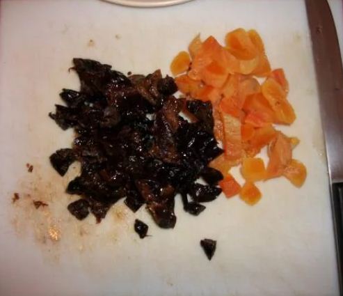 4. Курагу і чорнослив нарізаємо на шматочки. Залишаємо кілька, щоб красиво прикрасити страву.