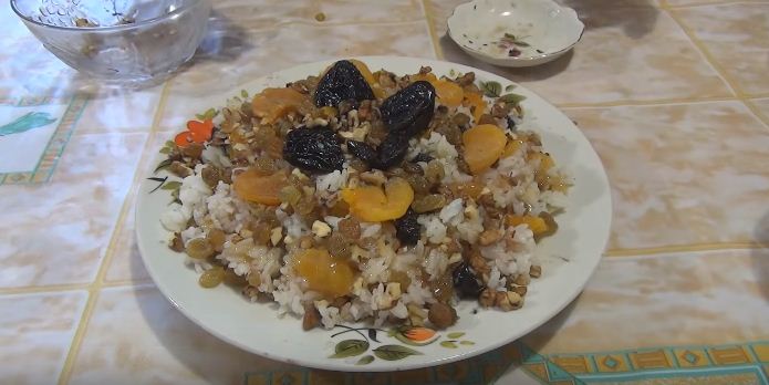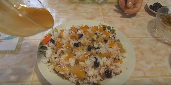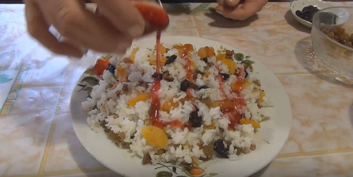6. Готовий рис викладаємо на велике блюдо. Зверху додаємо родзинки, волоські горіхи, нарізані курагу і чорнослив. Акуратно перемішуємо і поливаємо узваром із сухофруктів або сиропом. У нас це полуничний.