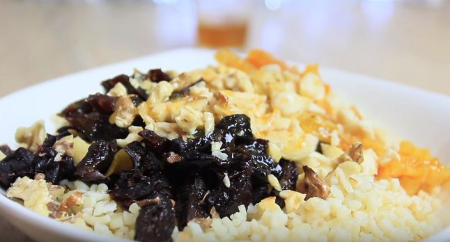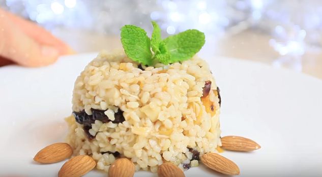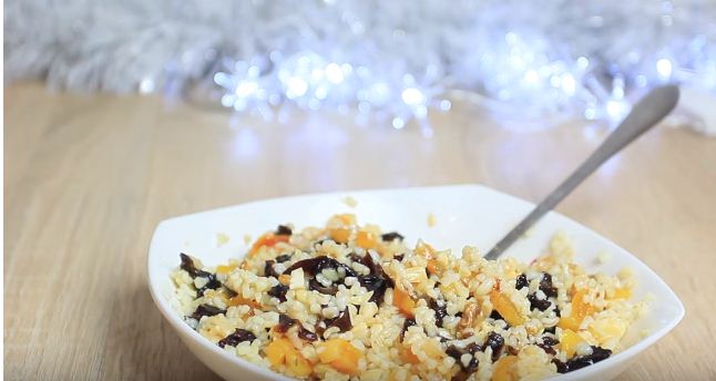 4. Булгур викладаємо в піалу. Зверху присмачую сухофруктами і горіхами.