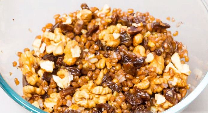 5. Готову пшеницю знімаємо знімаємо з плити і промиваємо під краном. Змішуємо з горіхами і родзинками. А також присмачую розведеним медом. Перемішуємо до рівномірності. Даємо настоятися пару годин в прохолодному місці і смачне блюдо готове!