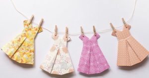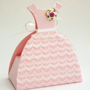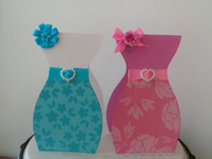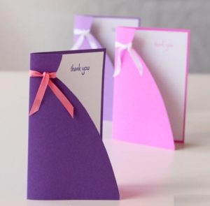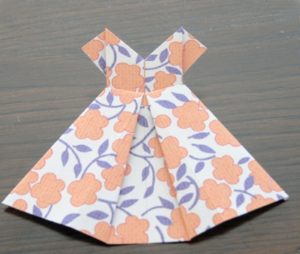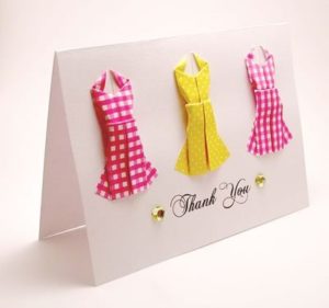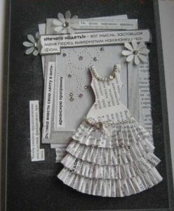 Останнім кроком створення листівки є приклеювання паперового сукні, виконаного в техніці орігамі, на основі листівки. Краще розмістити цей об’ємний елемент по центру вироби. Можна зробити декілька менших за розмірами паперових суконь і приклеїти їх на листівку. Одна з оригінальних ідей її оформлення представлена на фото.