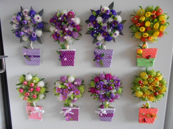 Ще один красивий, вишуканий і дивовижний подарунок до весняного свята представлений у вигляді магнітів-топіари, зроблених своїми руками. Вони виглядають витончено і стильно. Тому ними можна сміливо прикрашати будь-які поверхні, на яких тримається магніт.