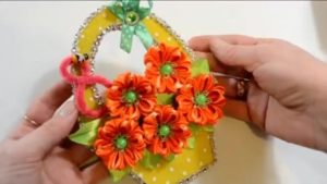 Всі ці елементи створять кошик. А для квіткового наповнення, яким можуть стати крокуси, знадобляться 25 відрізків атласної стрічки жовтого кольору (розмір 1,2 на 2 см). Також треба буде взяти 20 відрізків стрічки фіолетового відтінку аналогічного розміру і 35 відрізків зеленої атласної стрічки (розмір 1,2 на 2,5 см). Також знадобляться тичинки, 12 штук жовтого кольору і 15 фіолетового відтінку. Процес створення магніту можна переглянути за посиланням