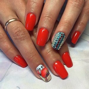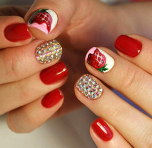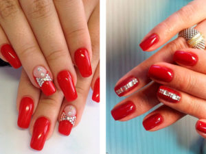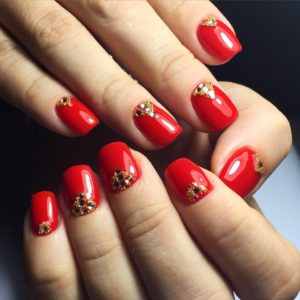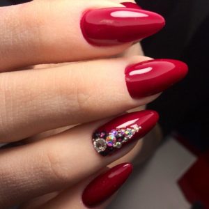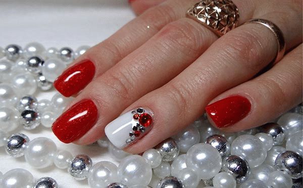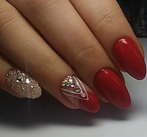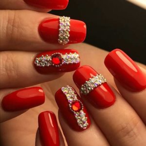 Манікюр з червоним лаком і стразами елегантно виглядає як на коротких, так і на довгих нігтях. Щоб дизайн був незвичайним, його розбавляють камінням, які додають витонченості і величі рук.