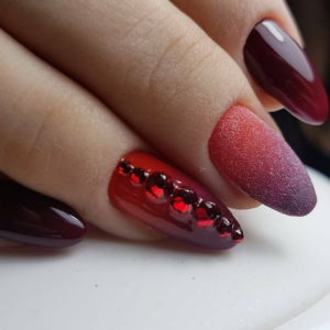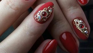 Сліпучими і величними виглядають червоні нігті з камінням. У такому варіанті зазвичай виділяють безіменний палець, викладаючи смуги і своєрідні візерунки. При цьому прикраси можуть бути будь-якої форми, але значно більшого розміру, ніж блискітки, які є доповненням до основного елементу і розташовуються навколо нього.