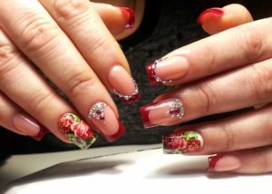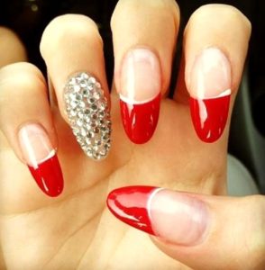 Манікюр в 2019 році червоний зі стразами цілком може бути виконаний у вигляді френча. Агресивність червоного легко приглушається білим кольором кінчиків, роблячи нігтьової дизайн чутливим і жіночним. Щоб надати руці блиску, стилісти рекомендують прикрасити один або два пальці камінчиками, закривши ними або всю поверхню, або невелику частину.