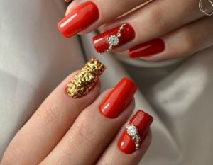 Яскравий червоний колір – вибір впевнених в собі жінок. Чудово доповнять образ стрази на червоних нігтях, викладені певним візерунком. Точково можна розташувати прикраси іншого відповідного кольору, наприклад, чорні або золоті, які будуть гармоніювати з основним відтінком.