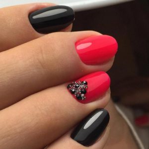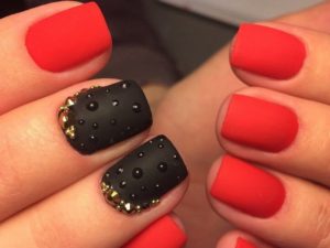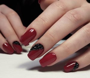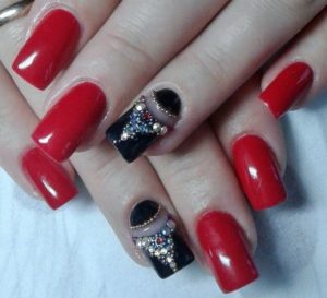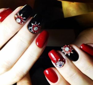 Найекстравагантнішим і модним поєднанням 2018-2019 роках є червоний і чорний. Існує безліч ідей виконання манікюру в цих відтінках. За основу береться будь-який тон з двох, а інший його розбавляє. Камені для прикраси використовують частіше чорні, вони роблять дизайн більш стильним. Їх можна доповнити мінімальною кількістю золотих або з металевим відливом.