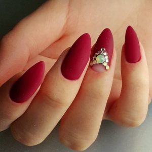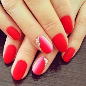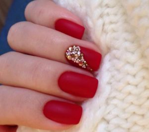 Неблискучим покриття полюбилося багатьма дівчатами за незвичайність і красу. Червоні матові нігті зі стразами – це відмінний спосіб виділити блискучі елементи, підкреслити жіночність і елегантність господині рук. Зазвичай такий шелак вибирають скромні натури, тому прикраси використовуються теж мінімальні, частіше всього на кількох пальцях.