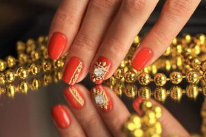 Святковий модний манікюр повинен бути яскравим і привертати увагу оточуючих. Тому ідеальним рішенням для фатальної красуні буде червоний шелак зі стразами і блискітками на нігтях. В процесі роботи потрібно дотримати всі пропорції прикрас. Досвідчені майстри радять поєднувати настільки яскраві елементи чергуванням: один палець виділити повністю блискітками, інший посипати невеликою кількістю каменів, а решта покрити тільки базовим лаком.