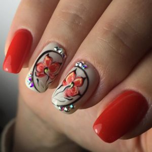 Малюнок – це найбільш надійний спосіб створити неповторний дизайн. Якщо немає талантів живописця, то зробити його можна з допомогою трафарету або наклеювання. Також під силу новачкові схематично виконати нескладні лінії, що нагадують квіткові візерунки. Прийнято розміщувати зображення на безіменному пальці. Камінчиками повністю виділяють інший ніготь, наприклад, середній. Такий манікюр буде виглядати незвичайним і цілком доречним на заході чи в повсякденному житті.