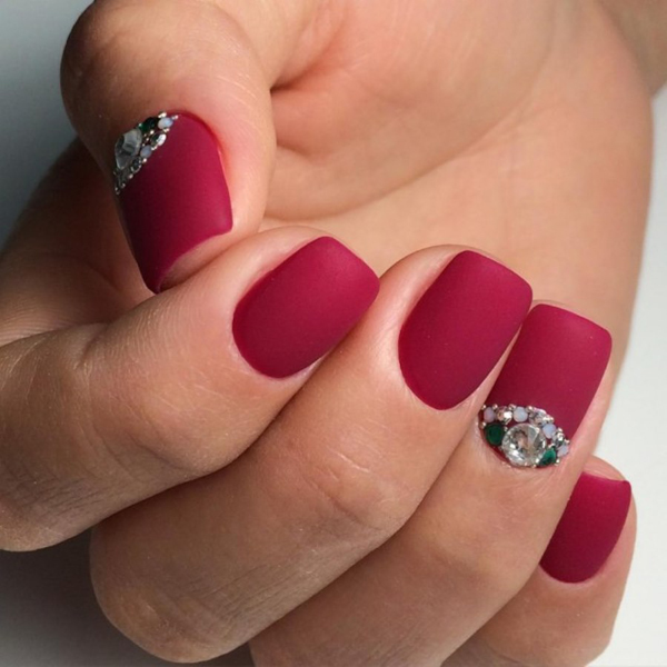 Матовий червоний дизайн нігтів зі стразами також залишається актуальним. Щоб розбавити, стилісти радять покрити один палець повністю камінням невеликого розміру або виділити лунки дугою або трикутником.