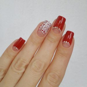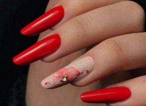 Якщо червоний використовують як базовий колір, то його розбавляють іншим менш яскравим відтінком. При цьому покриття може бути матовим, що додатково згладить агресивність лаку. Доповнення вибирають дрібні, прозорі або білі.