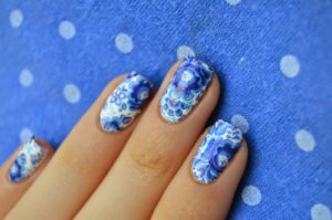 Для нанесення малюнка знадобиться тоненька пензлик і звичайна зубочистка. Спочатку нанести фонове покриття з білого лаку. Після намалювати заздалегідь вибраний орнамент, який декорувати синіми крапельками по фону.