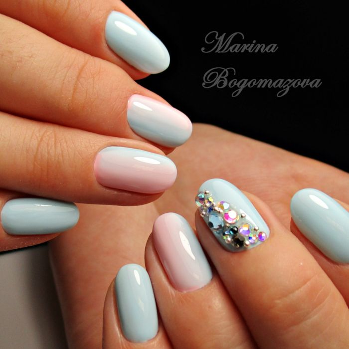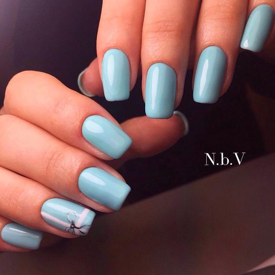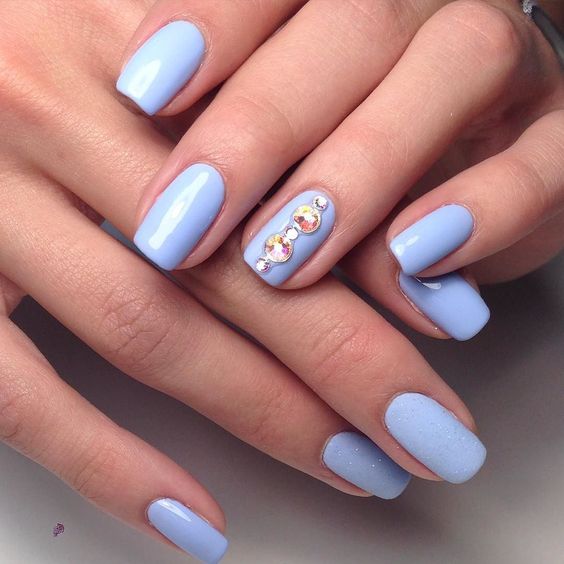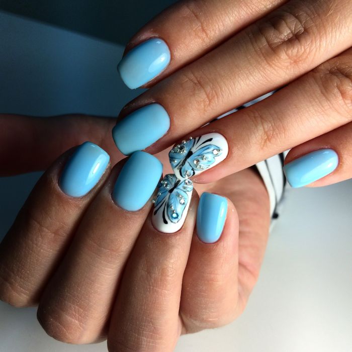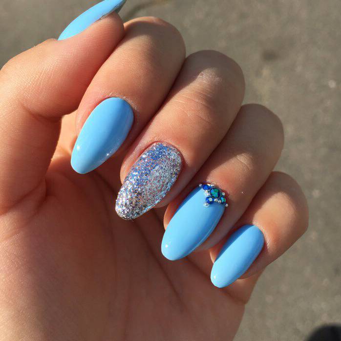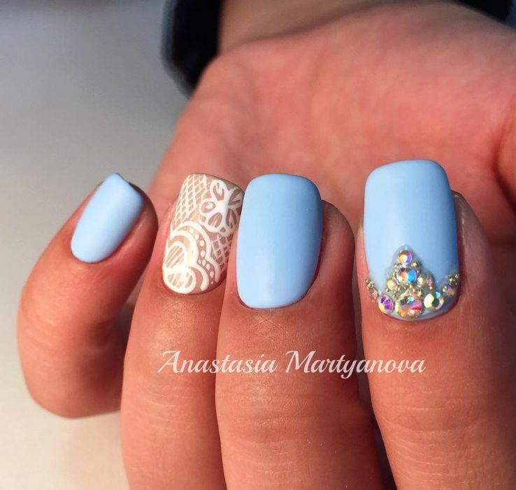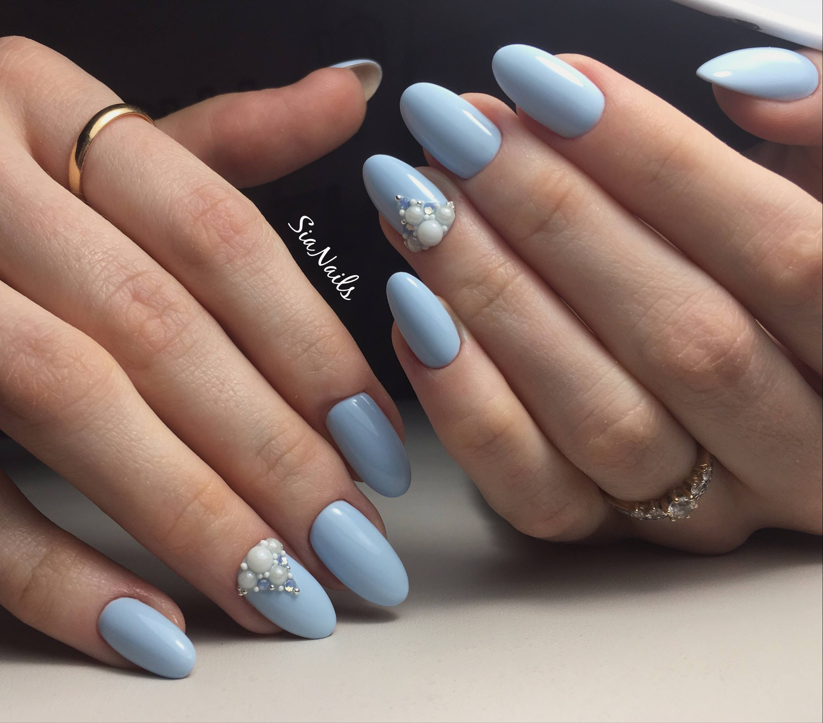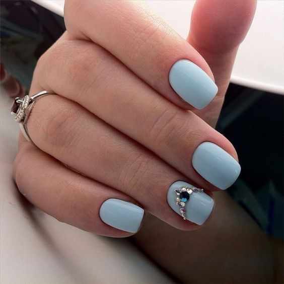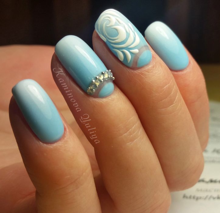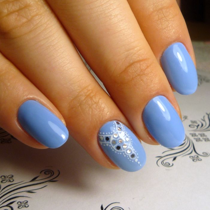Так як блакитний колір сам по собі дуже ніжний і спокійний, його часто вибирають для однорідного покриття. При бажанні його можна доповнити різними намистинами і стразами, щоб зробити дизайн трохи більш ефектним.