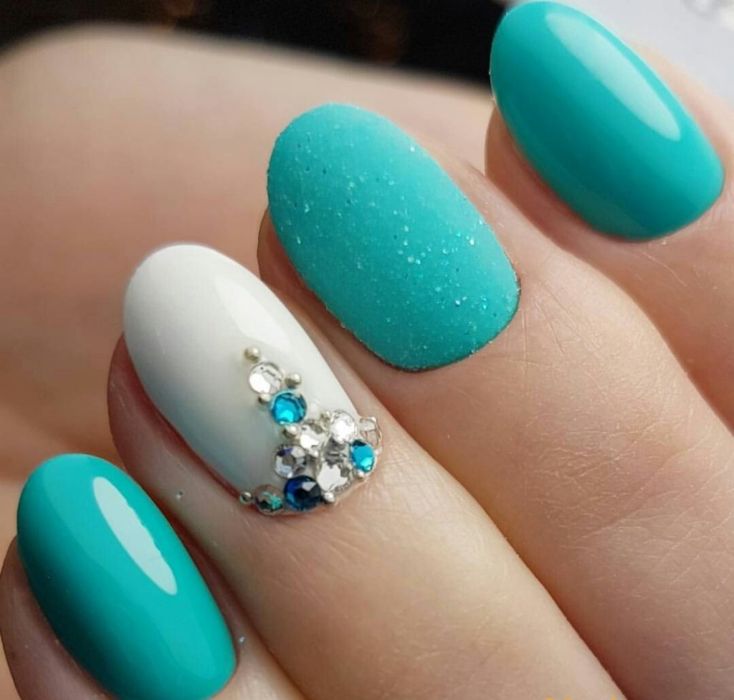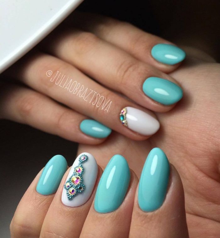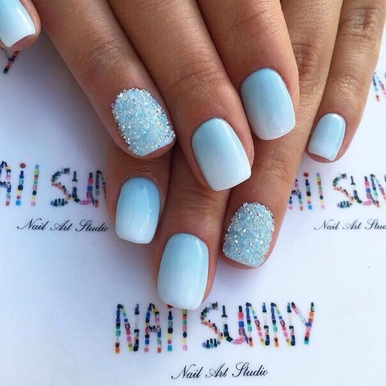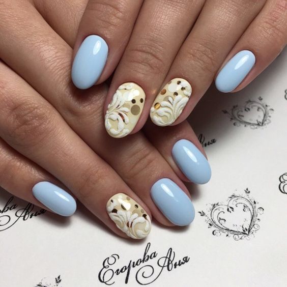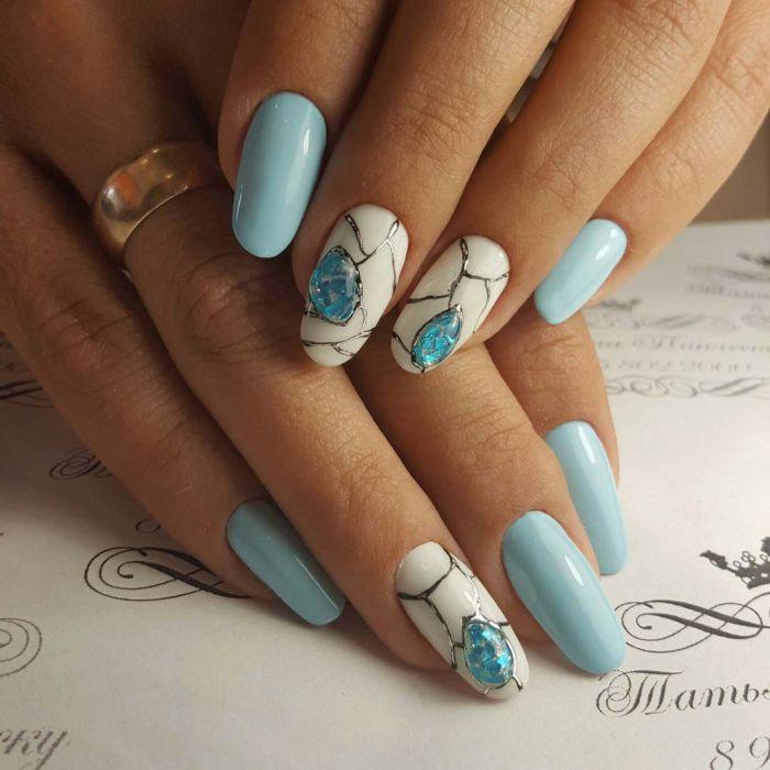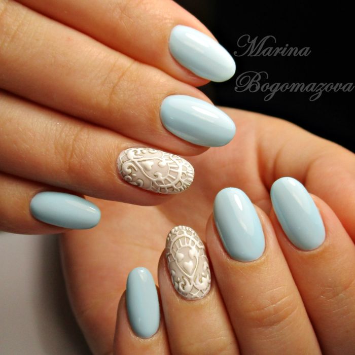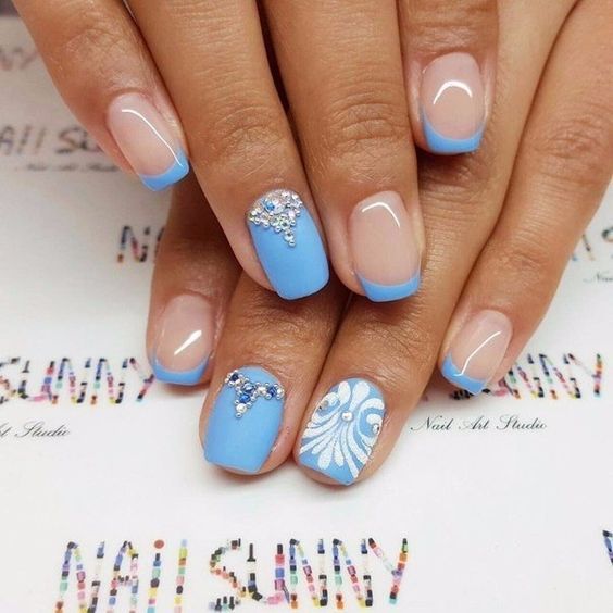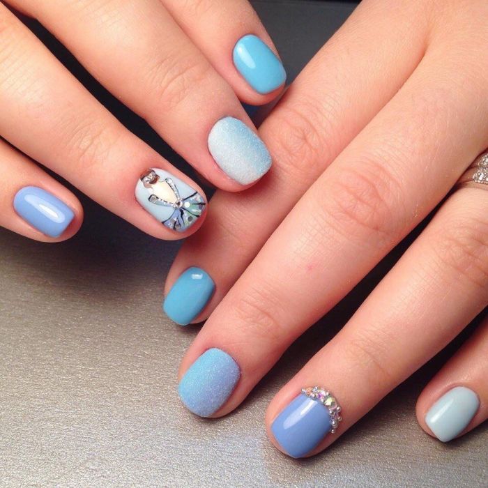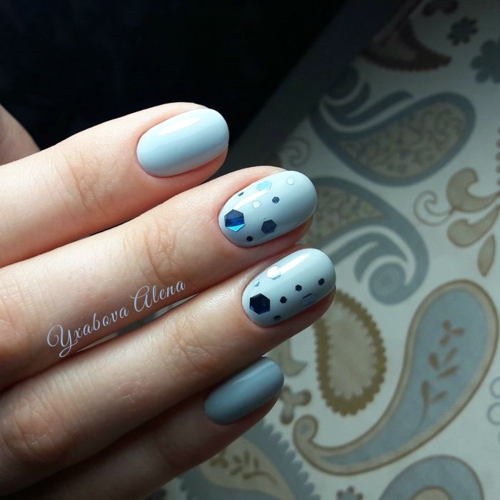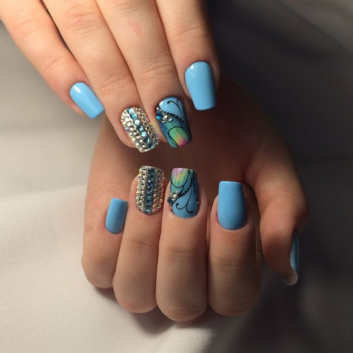 Так як блакитний колір сам по собі дуже ніжний і спокійний, його часто вибирають для однорідного покриття. При бажанні його можна доповнити різними намистинами і стразами, щоб зробити дизайн трохи більш ефектним.