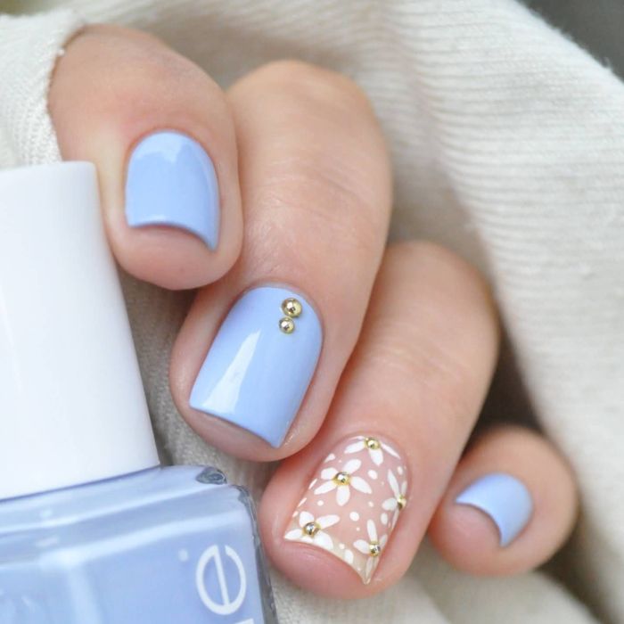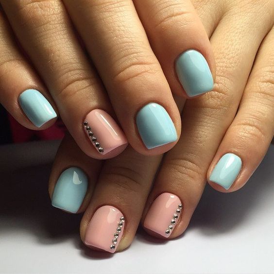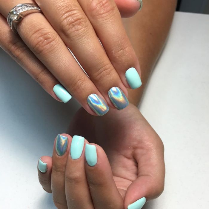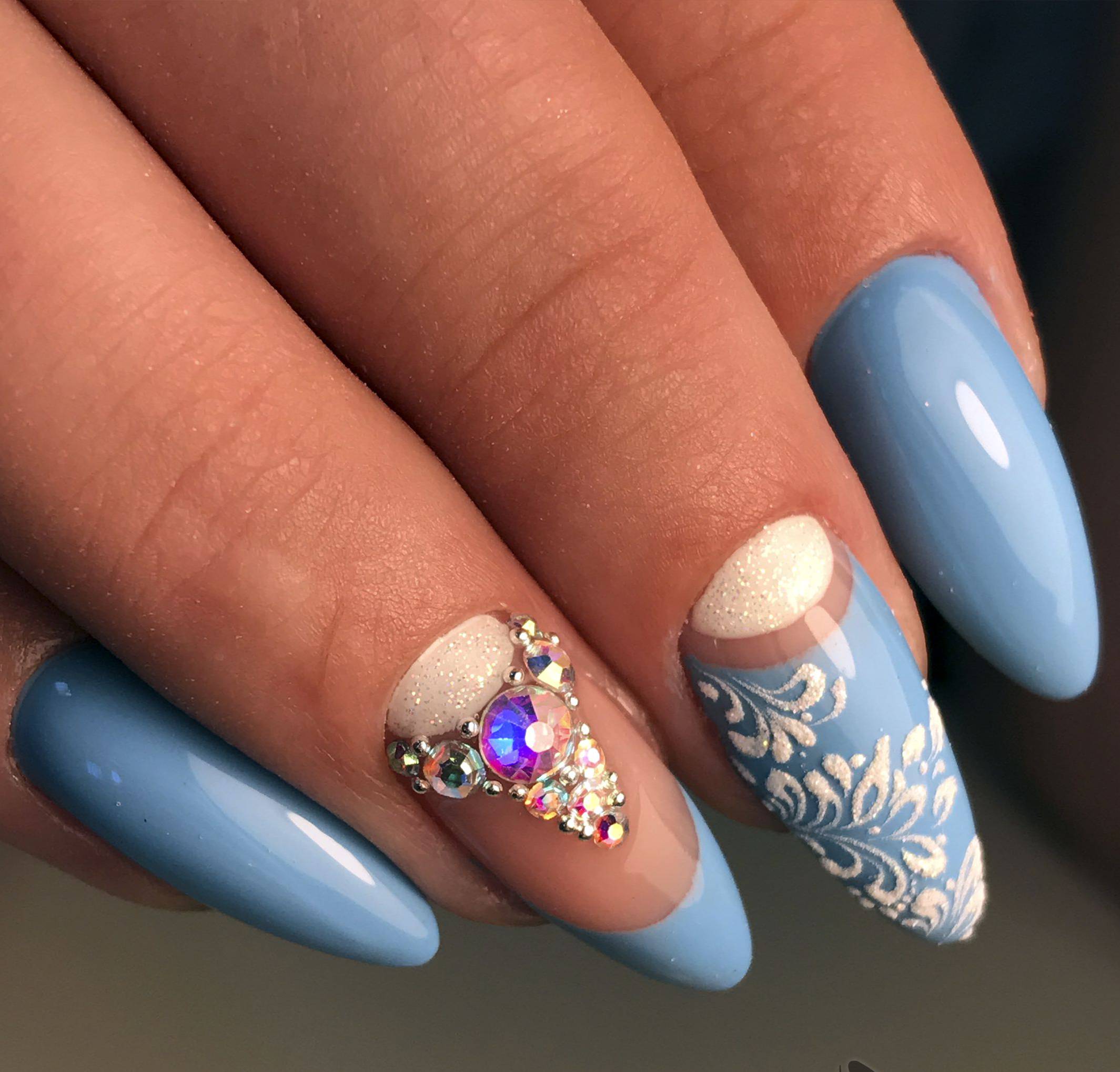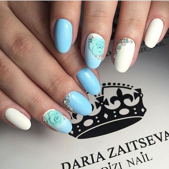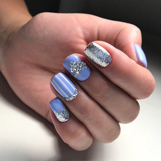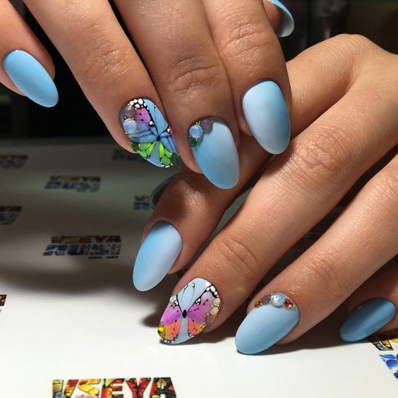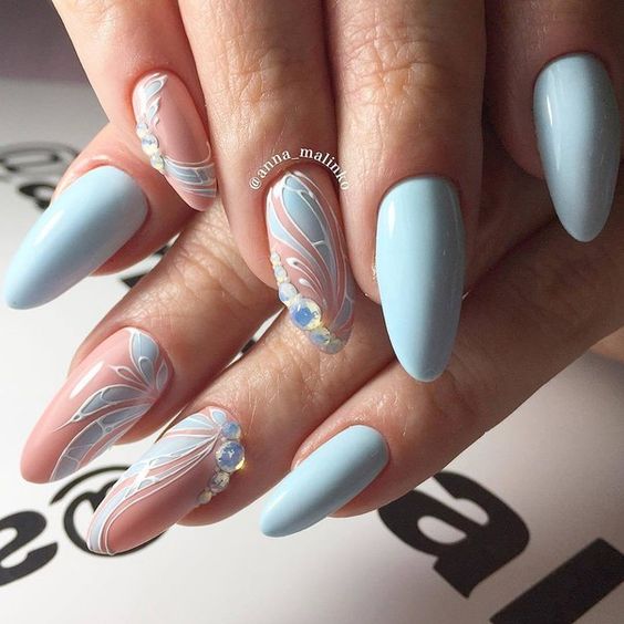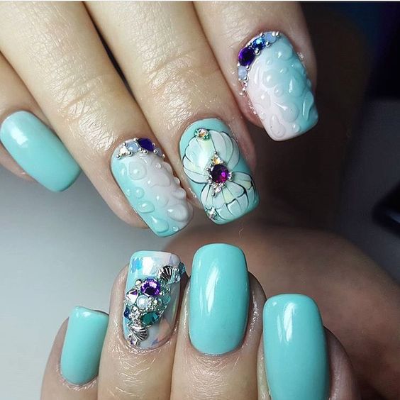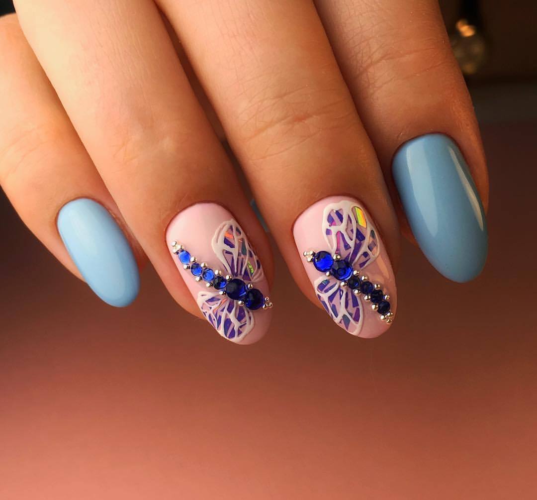 Так як блакитний колір сам по собі дуже ніжний і спокійний, його часто вибирають для однорідного покриття. При бажанні його можна доповнити різними намистинами і стразами, щоб зробити дизайн трохи більш ефектним.