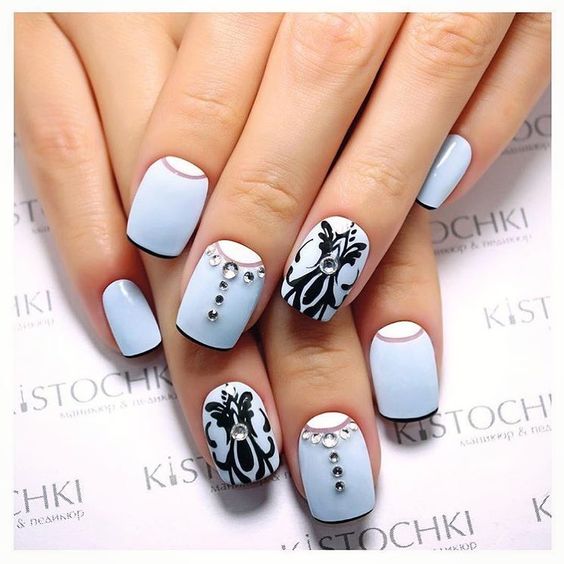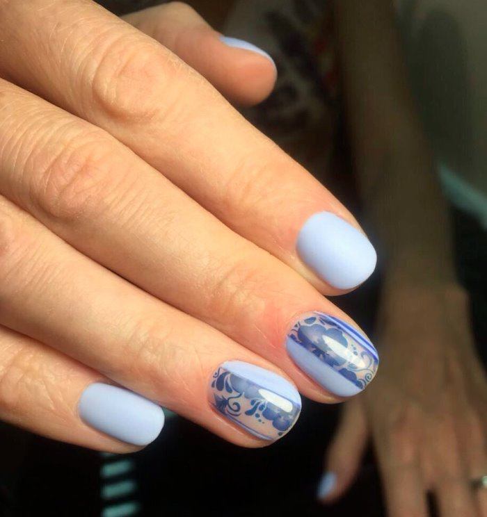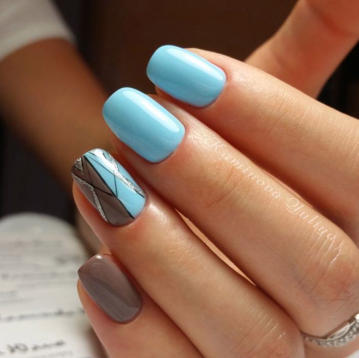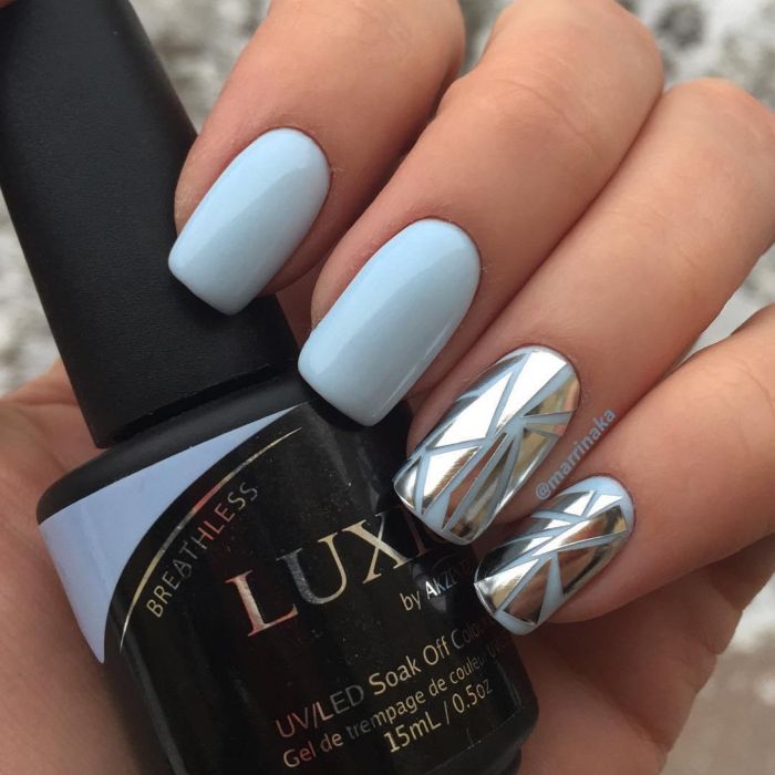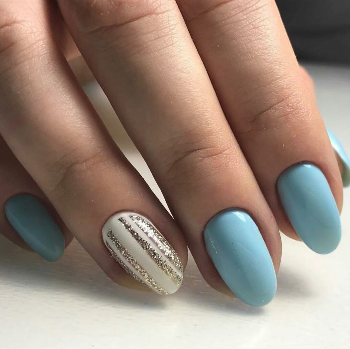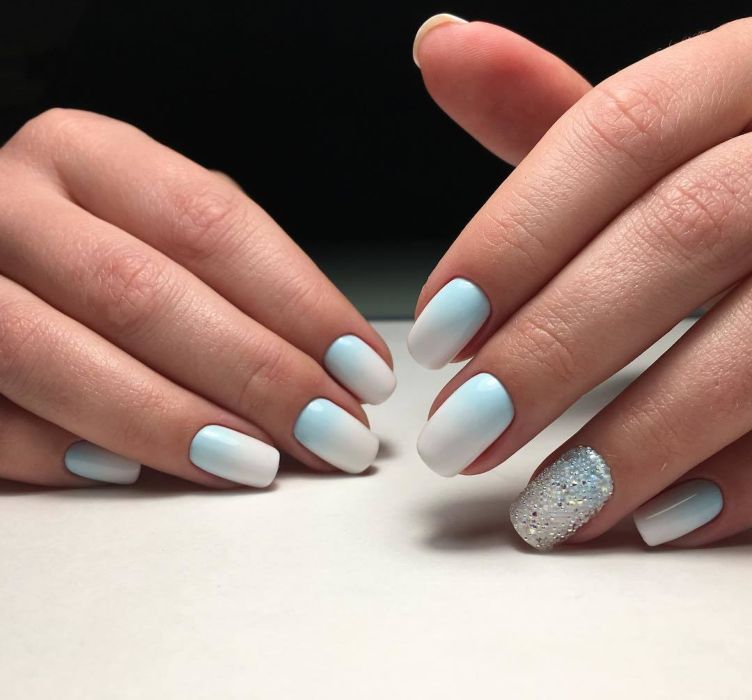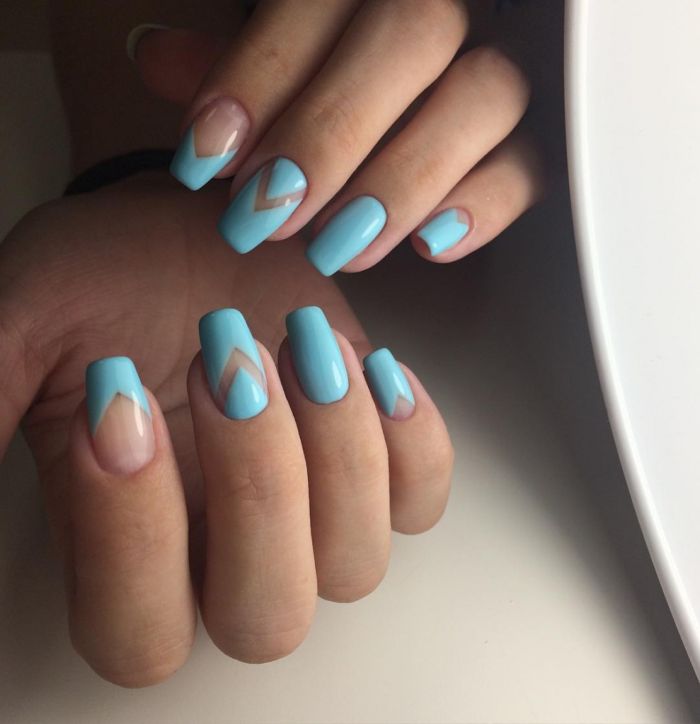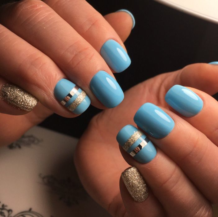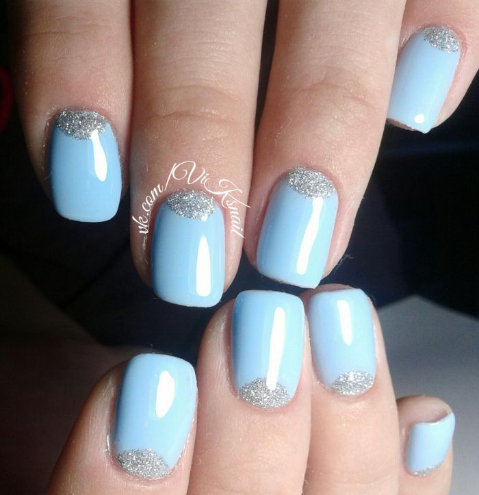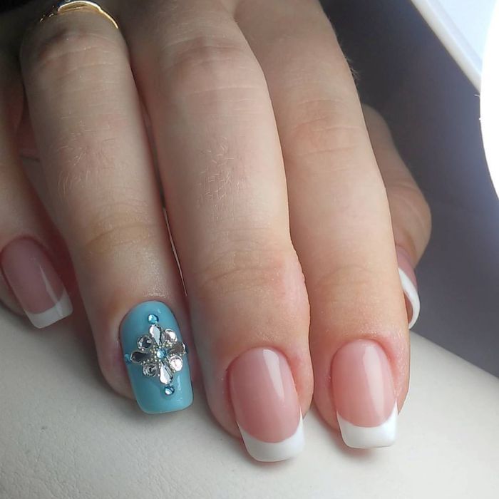 Незважаючи на велику популярність класичного дизайну, деколи хочеться внести різноманітність і доповнити цікавими деталями. В такому випадку можна просто поміняти відтінок на блакитний. За рахунок цього він буде виглядати зовсім по-іншому. До того ж, такий манікюр додасть вашому образу нотку ніжності і жіночності. До речі, незважаючи на нестандартне виконання, цей дизайн підходить навіть для роботи в офісі.